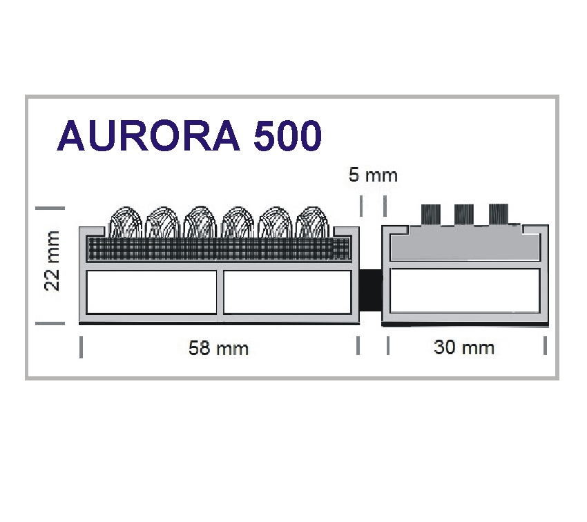 Die Verbindung der einzelnen Aluminiumprofile wird bei diesen Aluprofilmatten mittels kunststoffummanteltem Stahlseil hergestellt. Der Abstand zwischen den Aluminiumprofilen dieser Eingangsmatten, beträgt je nach gewählten Abstandsringen ca. 5 mm. Hierbei ist es möglich andere Abstandsringe zu verwenden, um einen geringeren Abstand zwischen den Aluminiumprofilen zu erreichen. Unter Berücksichtigung der Unfallverhütungsvorschrift bei Kindertagesstätten, können hier Zwischenringe von ca. 3-4 mm verwendet werden. Abgestreifte Schmutzpartikel werden so beim Aluprofilmattentyp AURORA 500 zwischen die Aluminiumprofile befördert und können dort entfernt werden.