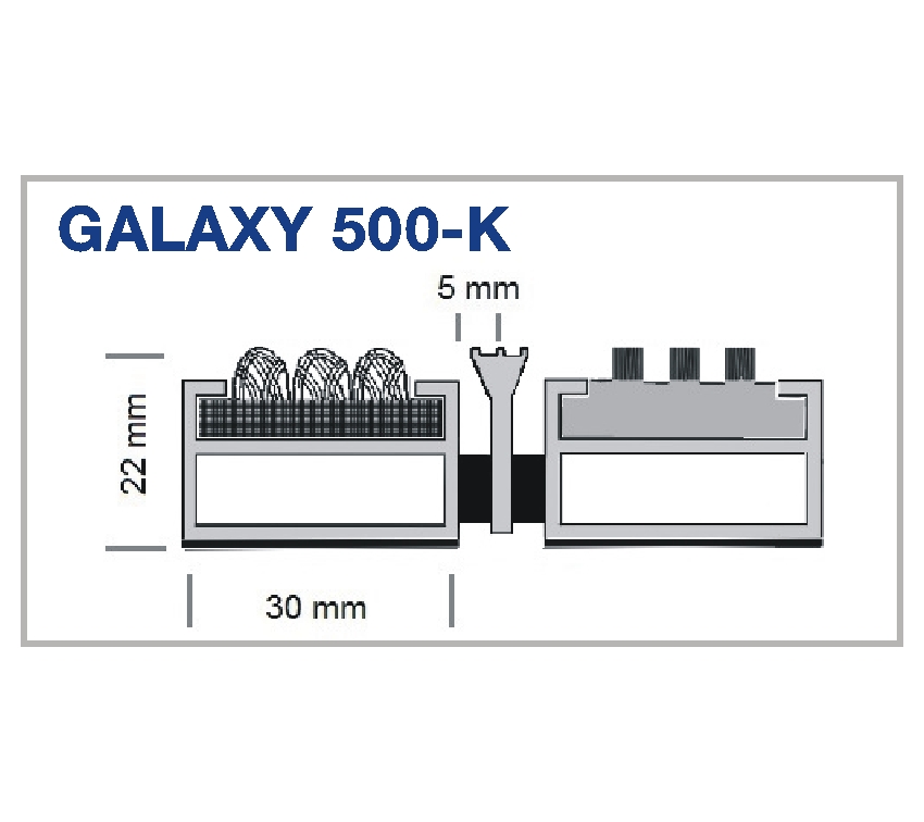 Die Verbindung der einzelnen Aluminiumprofile wird bei diesen Aluprofilmatten mittels kunststoffummanteltem Stahlseil hergestellt. Der Abstand zwischen den Aluminiumprofilen dieser Eingangsmatten, beträgt je nach gewählten Abstandsringen ca. 5 mm. Hierbei ist es möglich andere Abstandsringe zu verwenden, um einen geringeren Abstand zwischen den Aluminiumprofilen zu erreichen. Unter Berücksichtigung der Unfallverhütungsvorschrift bei Kindertagesstätten, können hier Zwischenringe von ca. 3-4 mm verwendet werden. Abgestreifte Schmutzpartikel werden so beim Aluprofilmattentyp GALAXY 500-K zwischen die Aluminiumprofile befördert und können dort entfernt werden.