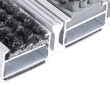 Aufrollbare Aluprofilmatte im Wechsel (1:1) mit einer Bürsteneinlage und Ripseinlage zusätzlich mit Aluminium Kratzkanten.