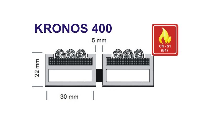 Die Verbindung der einzelnen Aluminiumprofile wird bei diesen Aluprofilmatten mittels kunststoffummanteltem Stahlseil hergestellt. Der Abstand zwischen den Aluminiumprofilen dieser Eingangsmatten, beträgt je nach gewählten Abstandsringen ca. 5 mm. Hierbei ist es möglich andere Abstandsringe zu verwenden, um einen geringeren Abstand zwischen den Aluminiumprofilen zu erreichen. Unter Berücksichtigung der Unfallverhütungsvorschrift bei Kindertagesstätten, können hier Zwischenringe von ca. 3-4 mm verwendet werden. Abgestreifte Schmutzpartikel werden so beim Aluprofilmattentyp KRONOS 400 zwischen die Aluminiumprofile befördert und können dort entfernt werden.