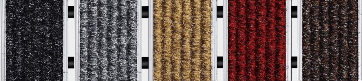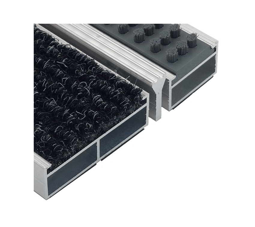 Aufrollbare Aluprofilmatte im Wechsel (1:1) mit einer Bürsteneinlage und Ripseinlage zusätzlich mit Aluminium Kratzkanten.