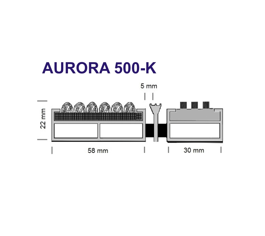 Die Verbindung der einzelnen Aluminiumprofile wird bei diesen Aluprofilmatten mittels kunststoffummanteltem Stahlseil hergestellt. Der Abstand zwischen den Aluminiumprofilen dieser Eingangsmatten, beträgt je nach gewählten Abstandsringen ca. 5 mm. Hierbei ist es möglich andere Abstandsringe zu verwenden, um einen geringeren Abstand zwischen den Aluminiumprofilen zu erreichen. Unter Berücksichtigung der Unfallverhütungsvorschrift bei Kindertagesstätten, können hier Zwischenringe von ca. 3-4 mm verwendet werden. Abgestreifte Schmutzpartikel werden so beim Aluprofilmattentyp AURORA 500-K zwischen die Aluminiumprofile befördert und können dort entfernt werden.