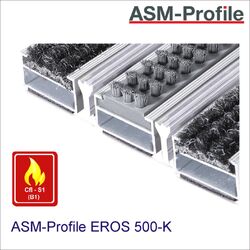 Die Verbindung der einzelnen Aluminiumprofile wird bei diesen Aluprofilmatten mittels kunststoffummanteltem Stahlseil hergestellt. Der Abstand zwischen den Aluminiumprofilen dieser Eingangsmatten, beträgt je nach gewählten Abstandsringen ca. 5 mm. Hierbei ist es möglich andere Abstandsringe zu verwenden, um einen geringeren Abstand zwischen den Aluminiumprofilen zu erreichen. Unter Berücksichtigung der Unfallverhütungsvorschrift bei Kindertagesstätten, können hier Zwischenringe von ca. 3-4 mm verwendet werden. Abgestreifte Schmutzpartikel werden so beim Aluprofilmattentyp EROS 500-K zwischen die Aluminiumprofile befördert und können dort entfernt werden.
