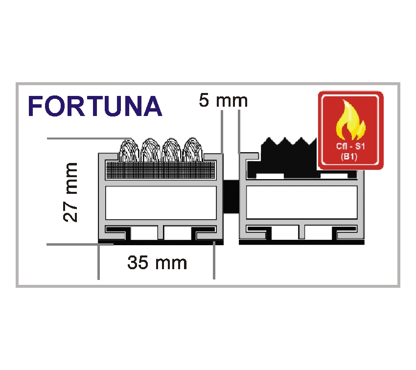 Die Verbindung der einzelnen Aluminiumprofile wird bei diesen Aluprofilmatten mittels kunststoffummanteltem Stahlseil hergestellt. Der Abstand zwischen den Aluminiumprofilen dieser Eingangsmatten, beträgt je nach gewählten Abstandsringen ca. 5 mm. Hierbei ist es möglich andere Abstandsringe zu verwenden, um einen geringeren Abstand zwischen den Aluminiumprofilen zu erreichen. Unter Berücksichtigung der Unfallverhütungsvorschrift bei Kindertagesstätten, können hier Zwischenringe von ca. 3-4 mm verwendet werden. Abgestreifte Schmutzpartikel werden so beim Aluprofilmattentyp FORTUNA zwischen die Aluminiumprofile befördert und können dort entfernt werden.
