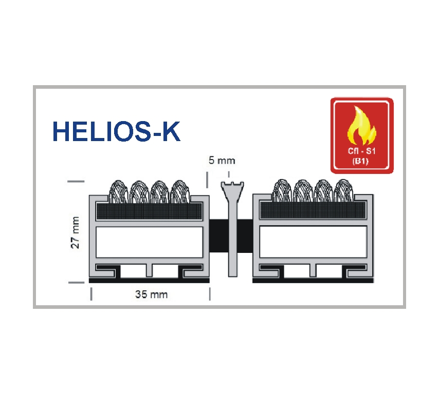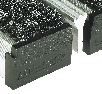 Die Verbindung der einzelnen Aluminiumprofile wird bei diesen Aluprofilmatten mittels kunststoffummanteltem Stahlseil hergestellt. Der Abstand zwischen den Aluminiumprofilen dieser Eingangsmatten, beträgt je nach gewählten Abstandsringen ca. 5 mm. Hierbei ist es möglich andere Abstandsringe zu verwenden, um einen geringeren Abstand zwischen den Aluminiumprofilen zu erreichen. Unter Berücksichtigung der Unfallverhütungsvorschrift bei Kindertagesstätten, können hier Zwischenringe von ca. 3-4 mm verwendet werden. Abgestreifte Schmutzpartikel werden so beim Aluprofilmattentyp HELIOS-K zwischen die Aluminiumprofile befördert und können dort entfernt werden.