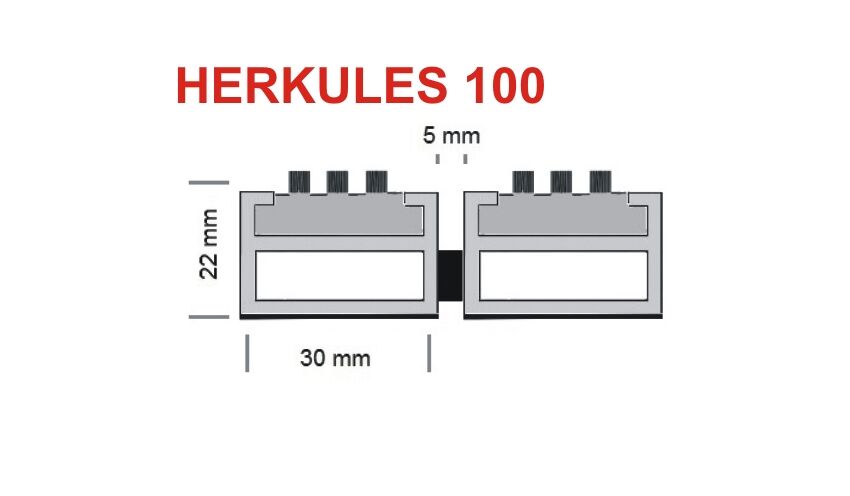 Die Verbindung der einzelnen Aluminiumprofile wird bei diesen Aluprofilmatten mittels kunststoffummanteltem Stahlseil hergestellt. Der Abstand zwischen den Aluminiumprofilen dieser Eingangsmatten, beträgt je nach gewählten Abstandsringen ca. 5 mm. Hierbei ist es möglich andere Abstandsringe zu verwenden, um einen geringeren Abstand zwischen den Aluminiumprofilen zu erreichen. Unter Berücksichtigung der Unfallverhütungsvorschrift bei Kindertagesstätten, können hier Zwischenringe von ca. 3-4 mm verwendet werden. Abgestreifte Schmutzpartikel werden so beim Aluprofilmattentyp HERKULES 100 zwischen die Aluminiumprofile befördert und können dort entfernt werden.