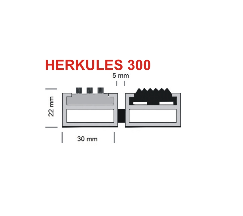 Die Verbindung der einzelnen Aluminiumprofile wird bei diesen Aluprofilmatten mittels kunststoffummanteltem Stahlseil hergestellt. Der Abstand zwischen den Aluminiumprofilen dieser Eingangsmatten, beträgt je nach gewählten Abstandsringen ca. 5 mm. Hierbei ist es möglich andere Abstandsringe zu verwenden, um einen geringeren Abstand zwischen den Aluminiumprofilen zu erreichen. Unter Berücksichtigung der Unfallverhütungsvorschrift bei Kindertagesstätten, können hier Zwischenringe von ca. 3-4 mm verwendet werden. Abgestreifte Schmutzpartikel werden so beim Aluprofilmattentyp HERKULES 300 zwischen die Aluminiumprofile befördert und können dort entfernt werden.