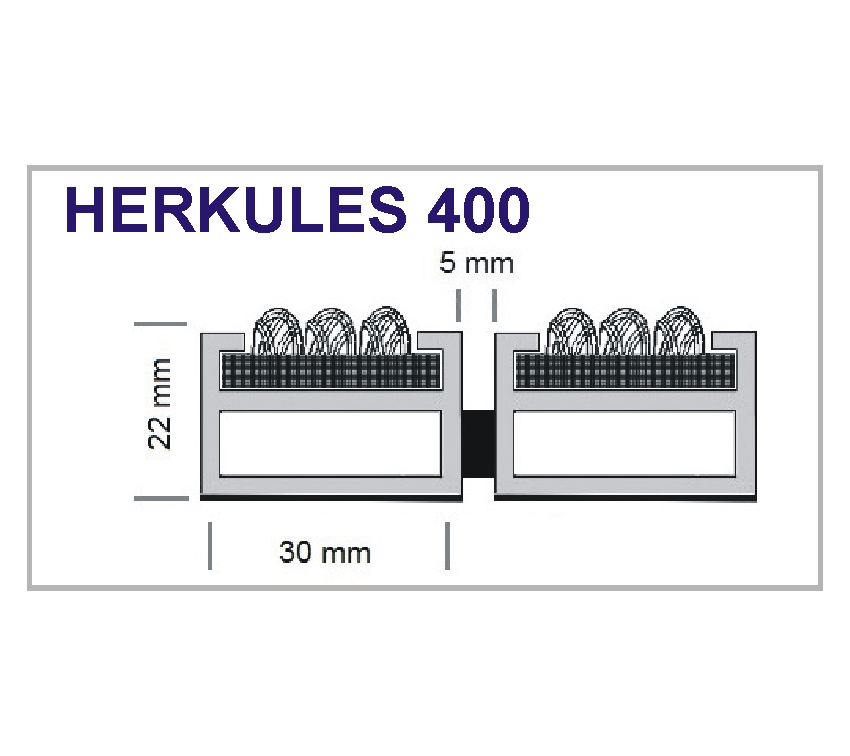 Die Verbindung der einzelnen Aluminiumprofile wird bei diesen Aluprofilmatten mittels kunststoffummanteltem Stahlseil hergestellt. Der Abstand zwischen den Aluminiumprofilen dieser Eingangsmatten, beträgt je nach gewählten Abstandsringen ca. 5 mm. Hierbei ist es möglich andere Abstandsringe zu verwenden, um einen geringeren Abstand zwischen den Aluminiumprofilen zu erreichen. Unter Berücksichtigung der Unfallverhütungsvorschrift bei Kindertagesstätten, können hier Zwischenringe von ca. 3-4 mm verwendet werden. Abgestreifte Schmutzpartikel werden so beim Aluprofilmattentyp HERKULES 400 zwischen die Aluminiumprofile befördert und können dort entfernt werden.