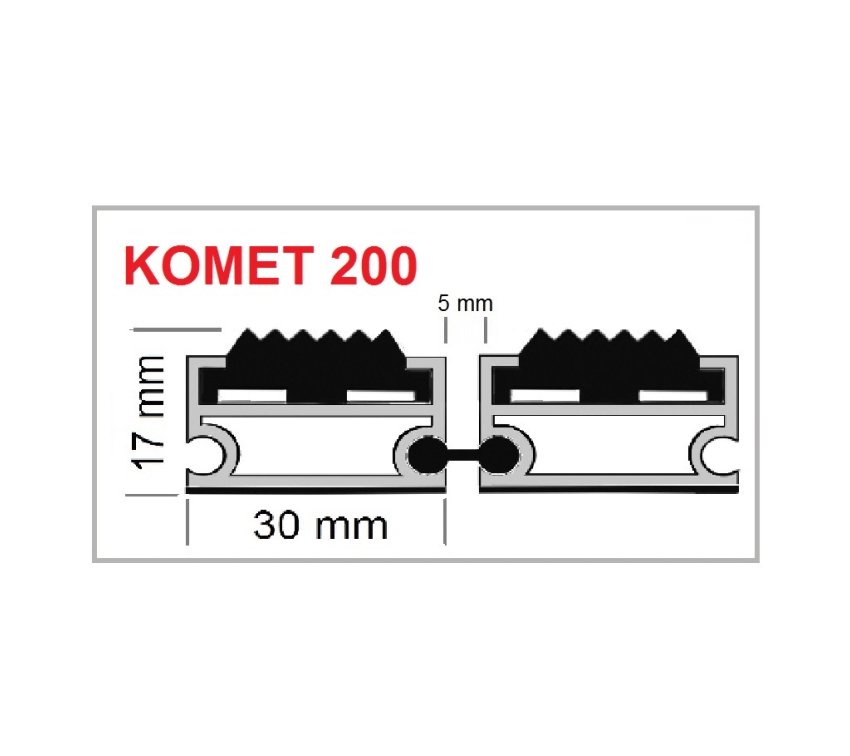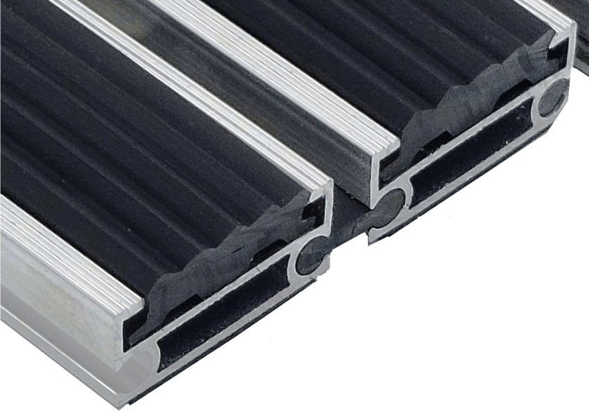 Die Verbindung der einzelnen Aluminiumprofile wird bei diesen Aluprofilmatten mittels eines gelochten, schwarzen Kunststoffverbinders hergestellt. Die Langlöcher weisen hierbei einen Durchmesser von ca. 4 mm auf. Abgestreifte Schmutzpartikel werden so beim Aluprofilmattentyp KOMET 200 zwischen die Aluminiumprofile befördert und können dort entfernt werden.