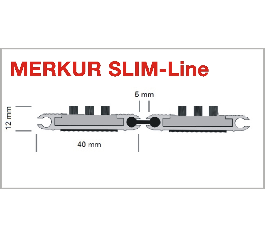Die Verbindung der einzelnen Aluminiumprofile wird bei diesen Aluprofilmatten mittels eines gelochten, schwarzen Kunststoffverbinders hergestellt. Die Langlöcher weisen hierbei einen Durchmesser von ca. 4 mm auf. Abgestreifte Schmutzpartikel werden so beim Aluprofilmattentyp MERKUR SLIM-Line zwischen die Aluminiumprofile befördert und können dort entfernt werden. Als Sonderausführung ist diese Kunststoffprofilschnur auch ohne Löcher erhältlich. (Hierbei ist auf eine vermehrte Reinigung des Reinstreifers zu achten.)