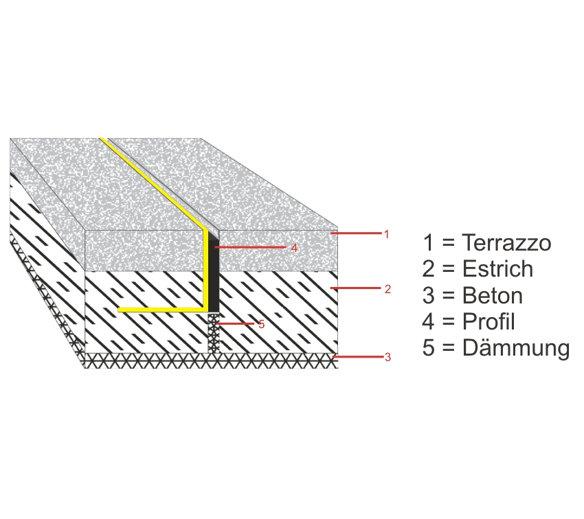 Unsere Terrazzoprofile werden mit einer 5 mm starken Neopren-Einlage in den Farben grau oder schwarz kraftschlüssig verklebt. Die durch die verwendete Neopren-Einlage entsprechende Bewegungsaufnahme beträgt: 1 mm + / -2 mm. Die angegebenen Belastungen sind nur bei Verwendung der Montageanleitung von ASM-Profile gewährleistet.